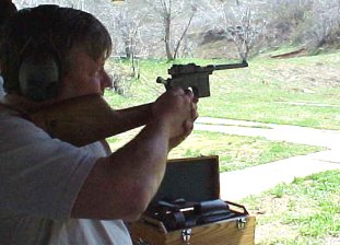 using the wooden holster that doubled as a shoulder stock for greater accuracy
