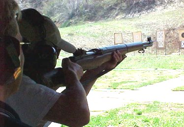 A Dad supervising his teen age son shooting the M1 Garand rifle.